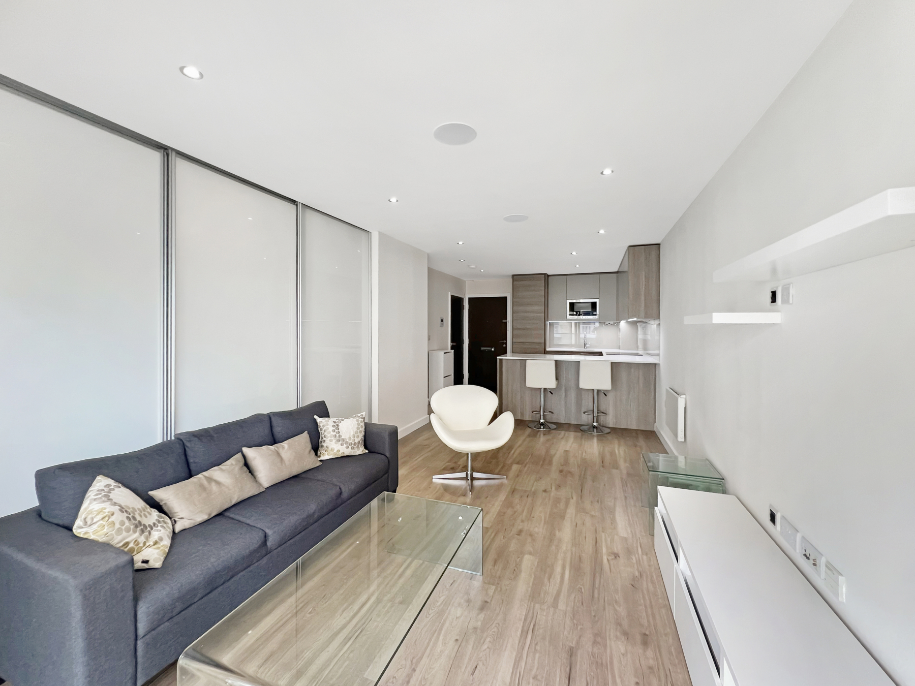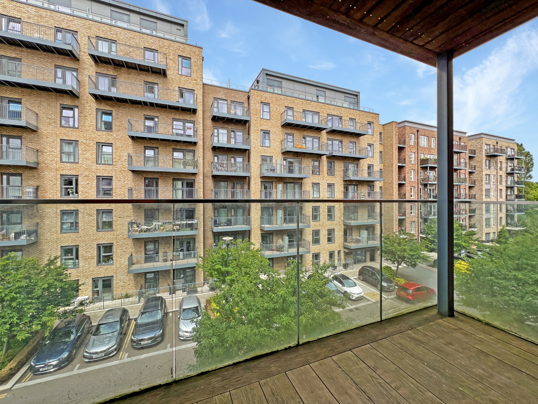 Located on the third floor of the sought-after Beaufort Park development, this spacious one-bedroom apartment offers over 440 square feet of stylish, lateral living space. The accommodation features a generous open-plan kitchen and reception room, a bedroom with a fitted wardrobe, a contemporary bathroom, a large balcony, and a utility cupboard with a washer/dryer.